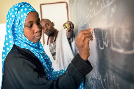 Aichetou writes at the blackboard / Credit GPE/Kelley Lynch
